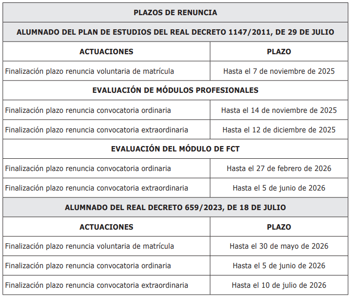 - Tendrá derecho a permanecer escolarizado el alumnado que haya mantenido la matrícula activa y haya superado algún módulo profesional durante el curso 2024/2025 en estas enseñanzas, siempre que no manifieste lo contrario, formalice la matrícula y la continuación no suponga el cambio de modalidad ni de centro educativo. No se considerarán módulos superados aquellos que hayan sido objeto de convalidación o exención.